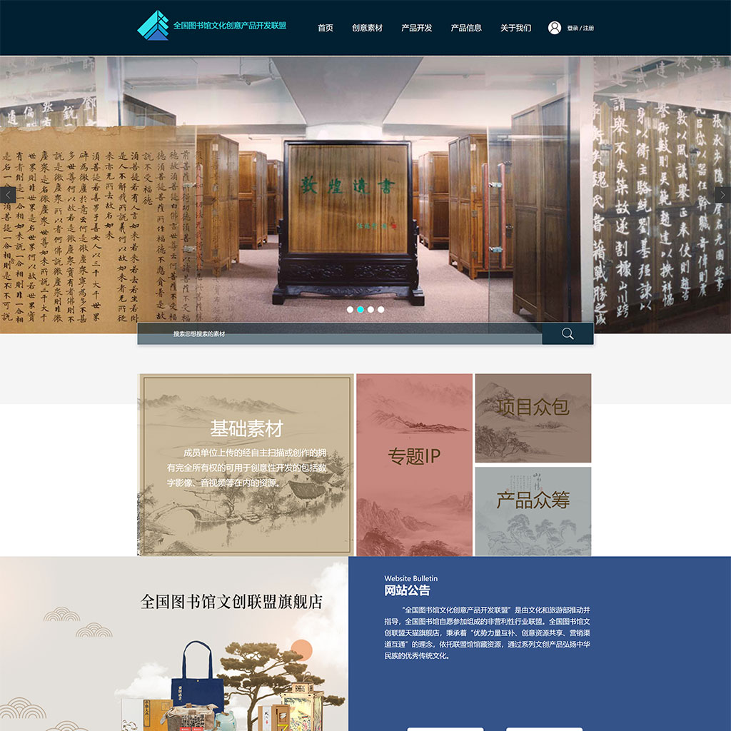 全国图书馆文化创意产品开发联盟,这是一个行业门户,包括多个应用,如:众包业务逻辑,众筹业务,电子商城等。